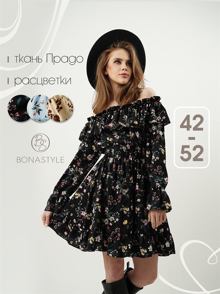 Женское платьице в цветочек - это находка для тех, кто ищет универсальную одежду для летнего гардероба. Короткое платье с открытыми плечами - прекрасное дополнение к образу, создаваемому в таких стилях, как романтический или свободное бохо. Пышная юбка до колен с оборкой придает особый шарм. Широкая резинка на талии не только делает его удобным в носке, но и оттеняет грациозность вашей фигуры, скрывает все недостатки в области живота и бедер. Благодаря эффектному декольте и волану на линии груди, бюст будет визуально выглядеть объемнее. Это оценят многие дамы. Длинные свободные рукава делают наше платье отличным вариантом как для весенне-летних дней, так и для прохладных вечеров.